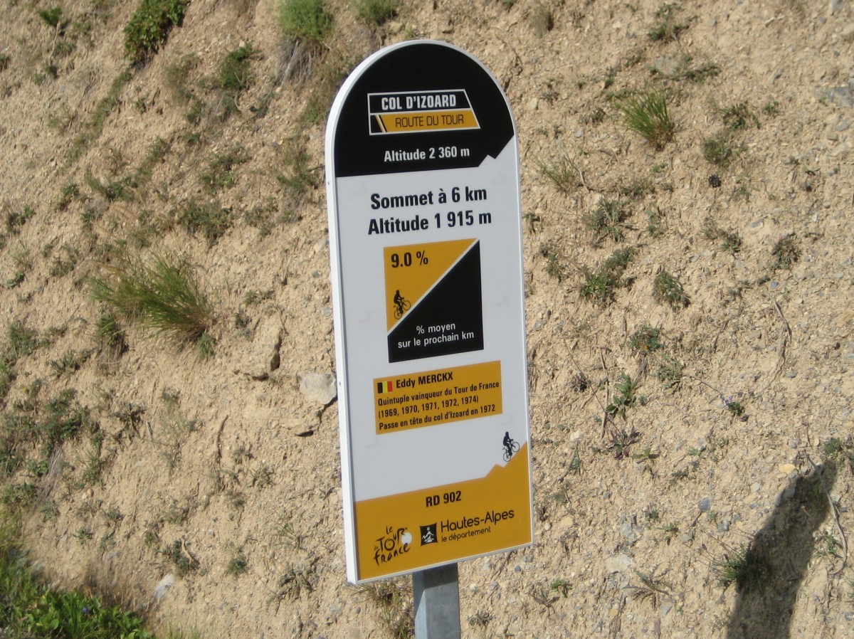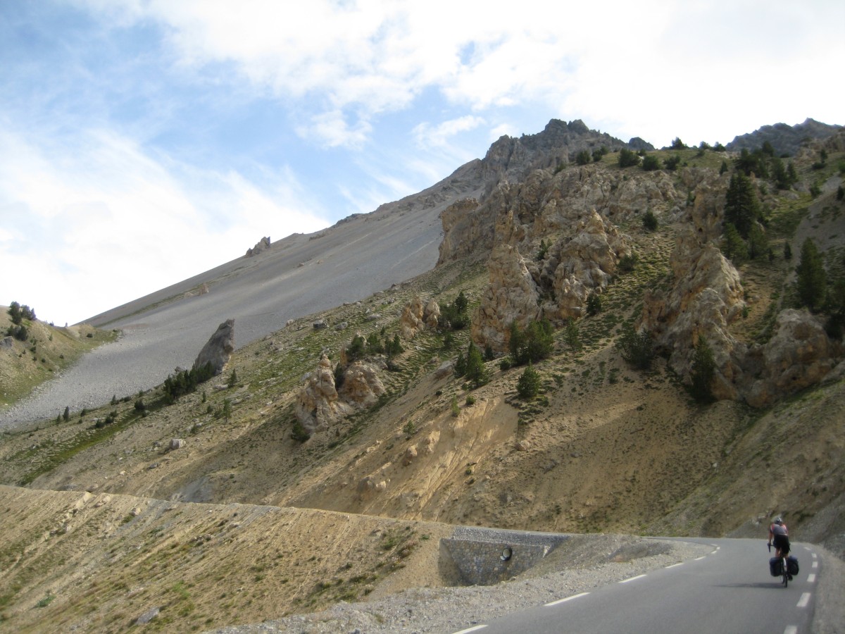 The climb was col d’Izoard (2360m) - it was on this year’s Tour de France route so there were still lots of banners and signs along the way. The were relatively few steep sections, lots of cyclists going up and the climb was enjoyable - it felt easy after Agnello. It was a beautiful sunny morning but not hot - nothing better than working your way up such an agreeable climb and enjoying the views. Near the top there was a surprise small descent and lots of geological formations of interest (at least, according to the signs).